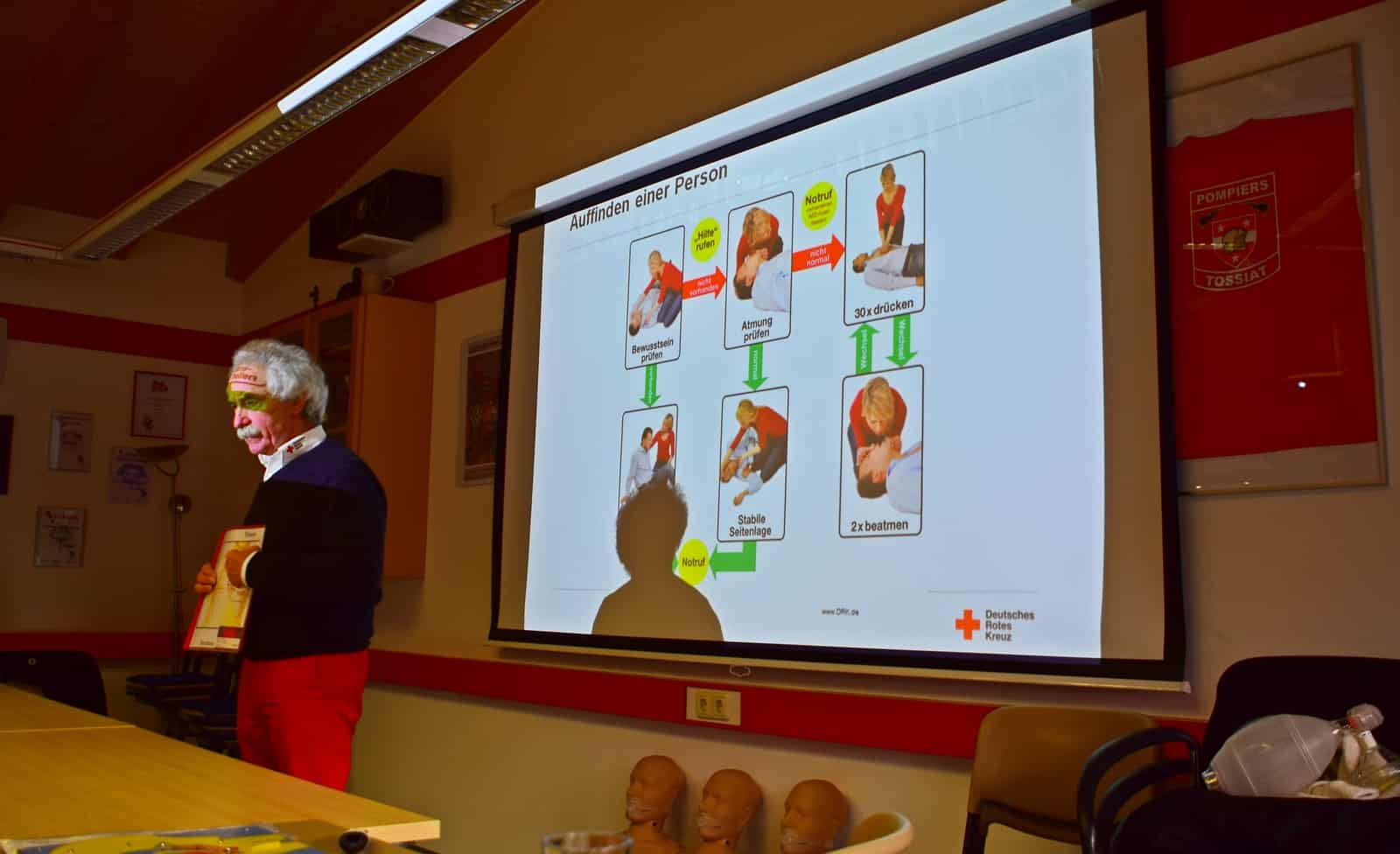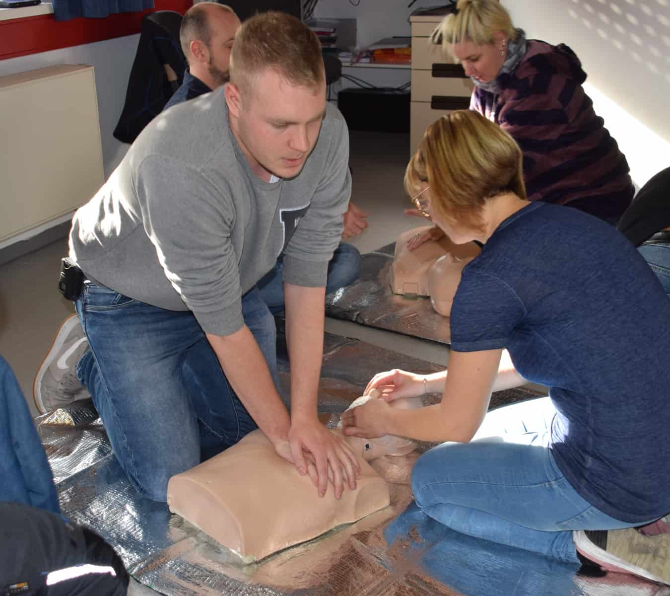 Im Rahmen der 2 Tage umfassenden Ausbildung wurden Grundlagen der notfallmedizinischen Versorgung, wie z.B. das Erkennen lebensbedrohlicher Zustände und deren Behandlung, Erstversorgung von Unfallopfern und Wiederbelebungsmaßnahmen unter anderem mit Hilfe des Defibrillators, vermittelt.