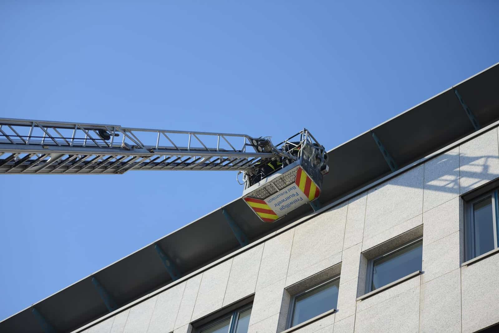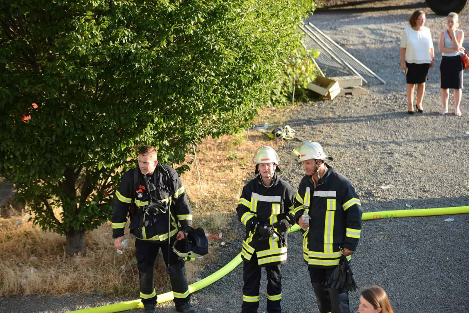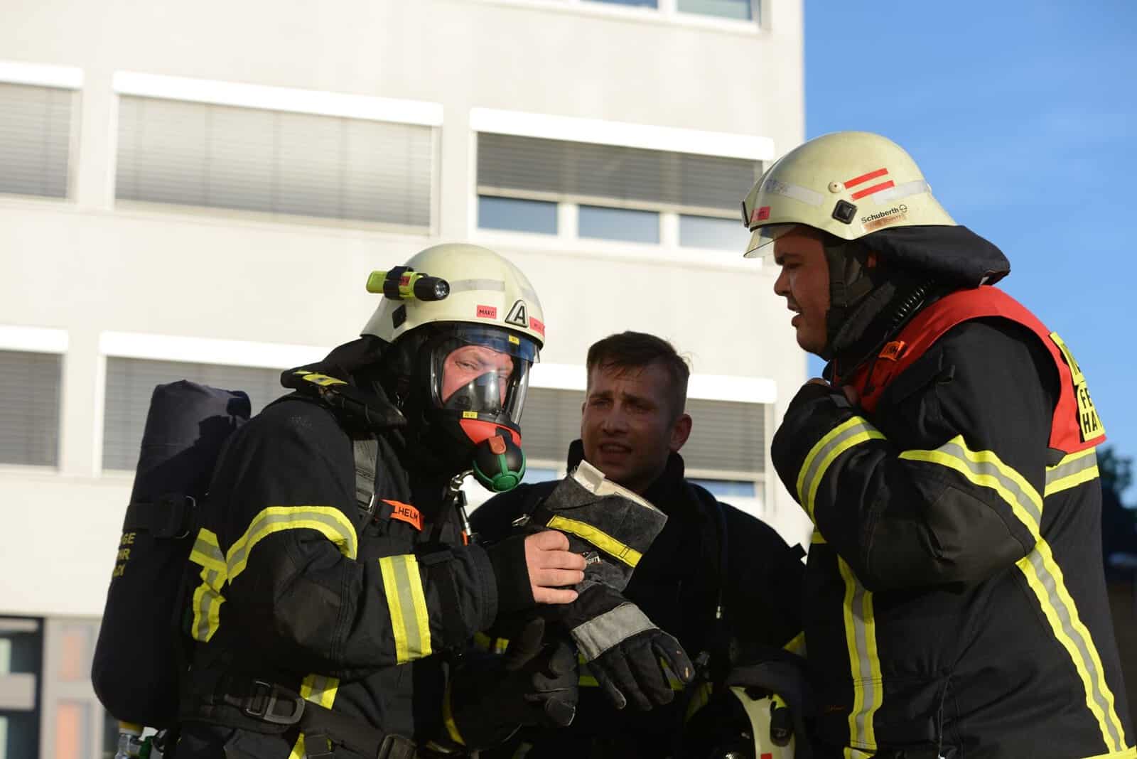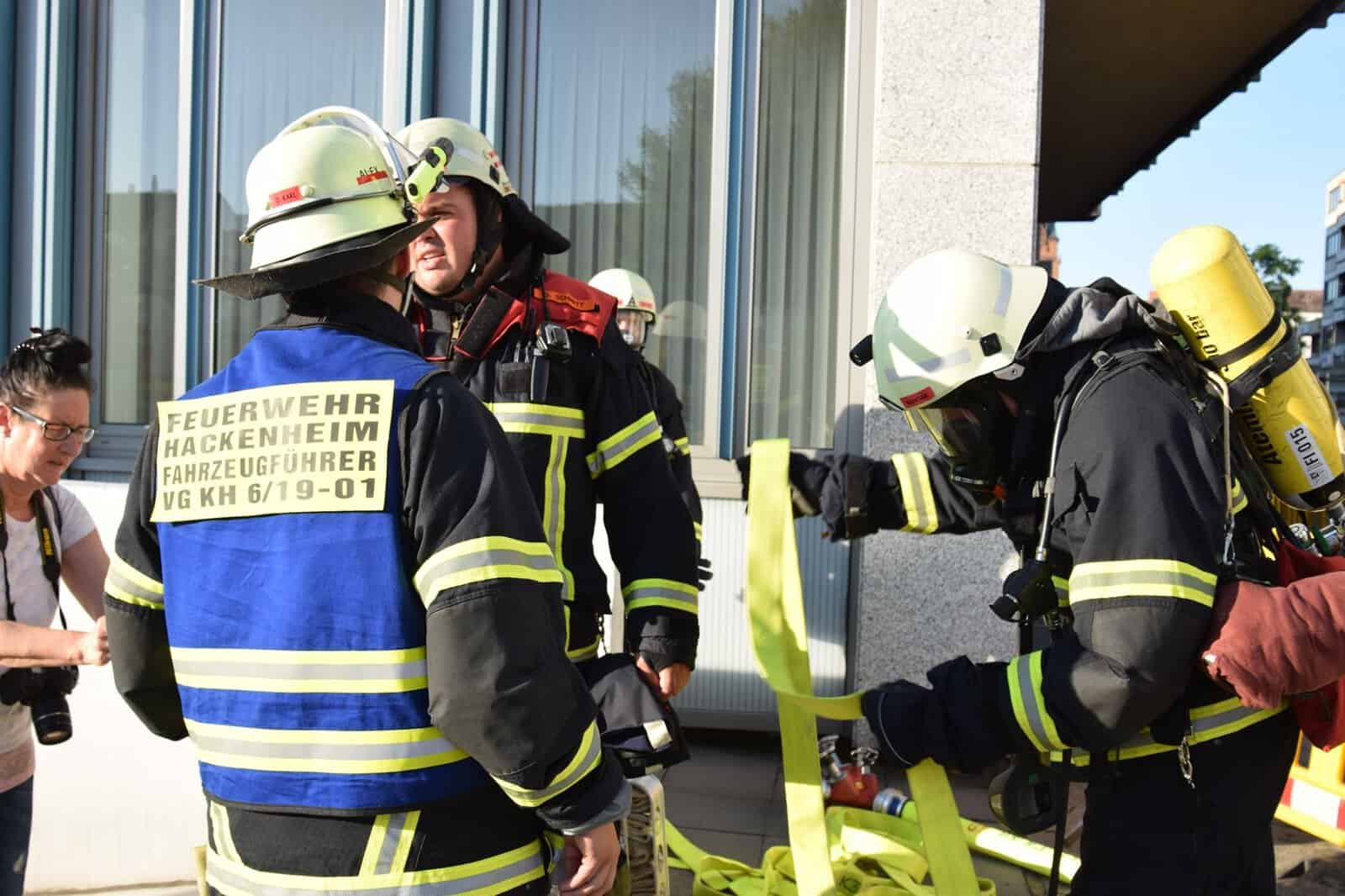 Die ersten angerückten Kräfte öffneten mit einem hydraulischen Türöffnungswerkzeug die Haupteingangstür, um in das Gebäude zu gelangen. Zwei Trupps unter Atemschutz gingen mit 2 C-Rohren zur Personenrettung und Brandbekämpfung über das Treppenhaus vor. Parallel wurde die Drehleiter in Stellung gebracht, um die beiden auf dem Dach befindlichen Personen zu retten. Die Person mit der Rückenverletzung musste schonend auf einer Trage auf der Tragehalterung am Korb der Drehleiter zu Boden gebracht werden. Dafür hatte sich Volksbankmitarbeiter Odo Steinmann (Vorstand Leitung Produktion/Steuerung) freiwillig gemeldet. Die Atemschutztrupps hatten nach und nach die vier Personen im Gebäude aufgespürt und ins Freie verbracht. Dabei wurden verschiedene Türöffnungsmethoden mit diversen Aufbruchswerkzeugen angewendet. Für eine Person kam jede Hilfe zu spät. Sie wurde in einer Schleifkorbtrage nach unten getragen. Die verrauchten Räumlichkeiten wurden mit einem Belüftungsgerät entraucht. Nach etwa einer Stunde hieß es dann Übungsende. An der Übung nahmen über 30 Feuerwehrleute mit insgesamt sieben Fahrzeugen des Löschbezirks Süd und der Freiwilligen Feuerwehr Hackenheim teil. Die Übungsleiter waren mit dem Ergebnis und der Zusammenarbeit der Wehrleute sehr zufrieden, besonders weil eine Außentemperatur von weit über 30°C vorherrschte und die Wehrleute besonders bei der Personenrettung unter Atemschutz in der Hitzeschutzbekleidung dadurch an ihr Limit gehen mussten. Odo Steinmann und Andreas Weber (Bauleiter der Firma Schoofs aus Frankfurt am Main) bedankte sich für den gezeigten Einsatz der Wehrleute und luden im Anschluss zu Kaltgetränken und Verpflegung ein. Auch die Übungsleiter und die Wehrleiterin Manuela Liebetanz bedankten sich beim Vorstand der Volksbank Rhein-Nahe-Hunsrück für die Möglichkeit in dem Objekt unter sehr realen Bedingungen üben zu können. Wo können sonst Türen zu Übungszwecken aufgebrochen werden? Und auch das will bei einem Realeinsatz geübt sein.