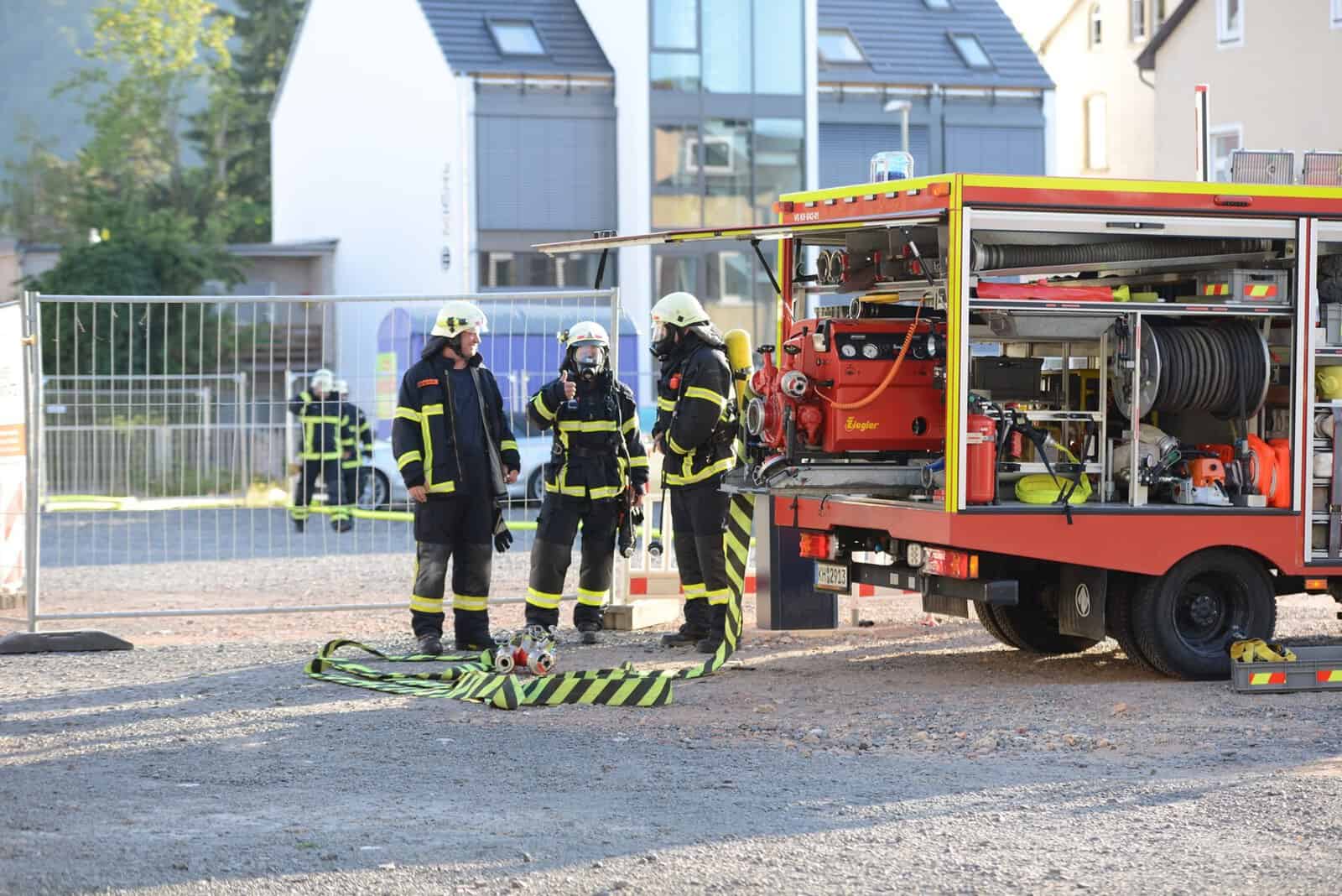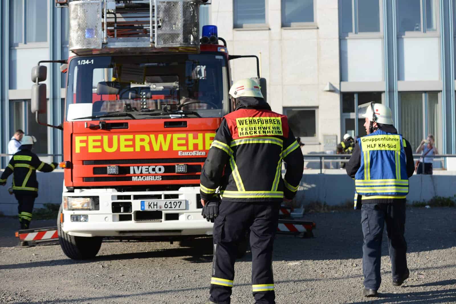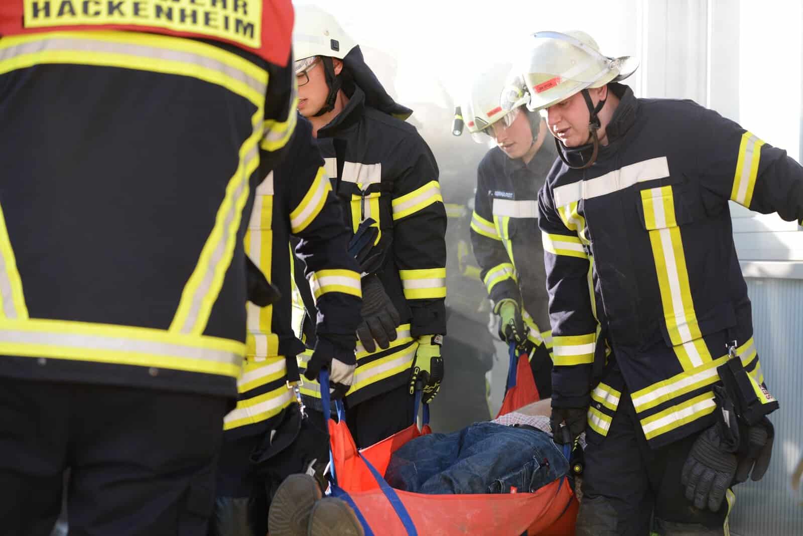 Die ersten angerückten Kräfte öffneten mit einem hydraulischen Türöffnungswerkzeug die Haupteingangstür, um in das Gebäude zu gelangen. Zwei Trupps unter Atemschutz gingen mit 2 C-Rohren zur Personenrettung und Brandbekämpfung über das Treppenhaus vor. Parallel wurde die Drehleiter in Stellung gebracht, um die beiden auf dem Dach befindlichen Personen zu retten. Die Person mit der Rückenverletzung musste schonend auf einer Trage auf der Tragehalterung am Korb der Drehleiter zu Boden gebracht werden. Dafür hatte sich Volksbankmitarbeiter Odo Steinmann (Vorstand Leitung Produktion/Steuerung) freiwillig gemeldet. Die Atemschutztrupps hatten nach und nach die vier Personen im Gebäude aufgespürt und ins Freie verbracht. Dabei wurden verschiedene Türöffnungsmethoden mit diversen Aufbruchswerkzeugen angewendet. Für eine Person kam jede Hilfe zu spät. Sie wurde in einer Schleifkorbtrage nach unten getragen. Die verrauchten Räumlichkeiten wurden mit einem Belüftungsgerät entraucht. Nach etwa einer Stunde hieß es dann Übungsende. An der Übung nahmen über 30 Feuerwehrleute mit insgesamt sieben Fahrzeugen des Löschbezirks Süd und der Freiwilligen Feuerwehr Hackenheim teil. Die Übungsleiter waren mit dem Ergebnis und der Zusammenarbeit der Wehrleute sehr zufrieden, besonders weil eine Außentemperatur von weit über 30°C vorherrschte und die Wehrleute besonders bei der Personenrettung unter Atemschutz in der Hitzeschutzbekleidung dadurch an ihr Limit gehen mussten. Odo Steinmann und Andreas Weber (Bauleiter der Firma Schoofs aus Frankfurt am Main) bedankte sich für den gezeigten Einsatz der Wehrleute und luden im Anschluss zu Kaltgetränken und Verpflegung ein. Auch die Übungsleiter und die Wehrleiterin Manuela Liebetanz bedankten sich beim Vorstand der Volksbank Rhein-Nahe-Hunsrück für die Möglichkeit in dem Objekt unter sehr realen Bedingungen üben zu können. Wo können sonst Türen zu Übungszwecken aufgebrochen werden? Und auch das will bei einem Realeinsatz geübt sein.