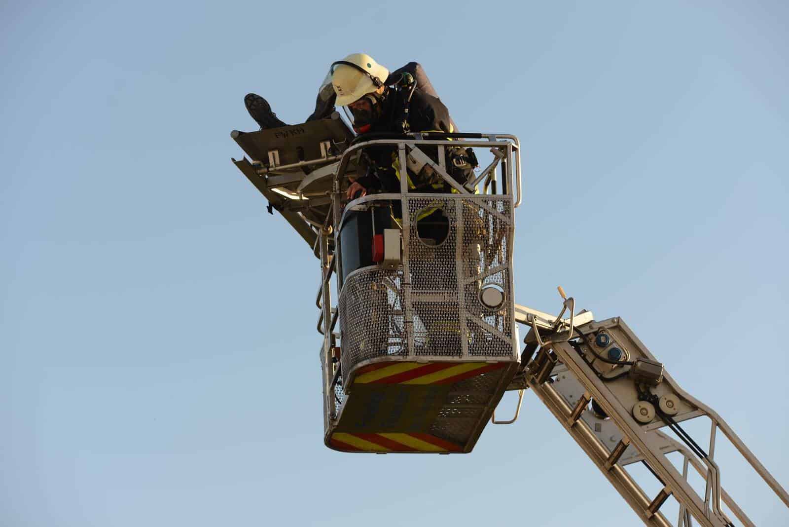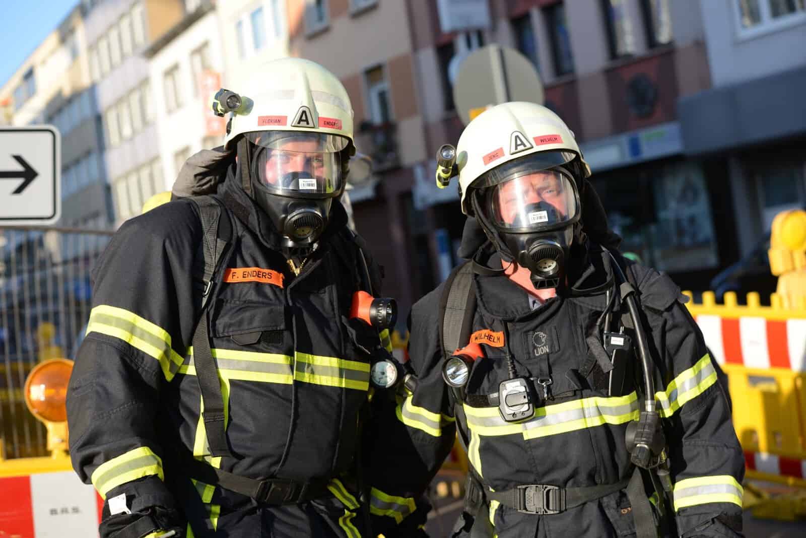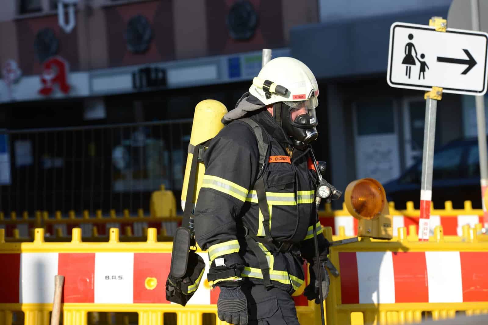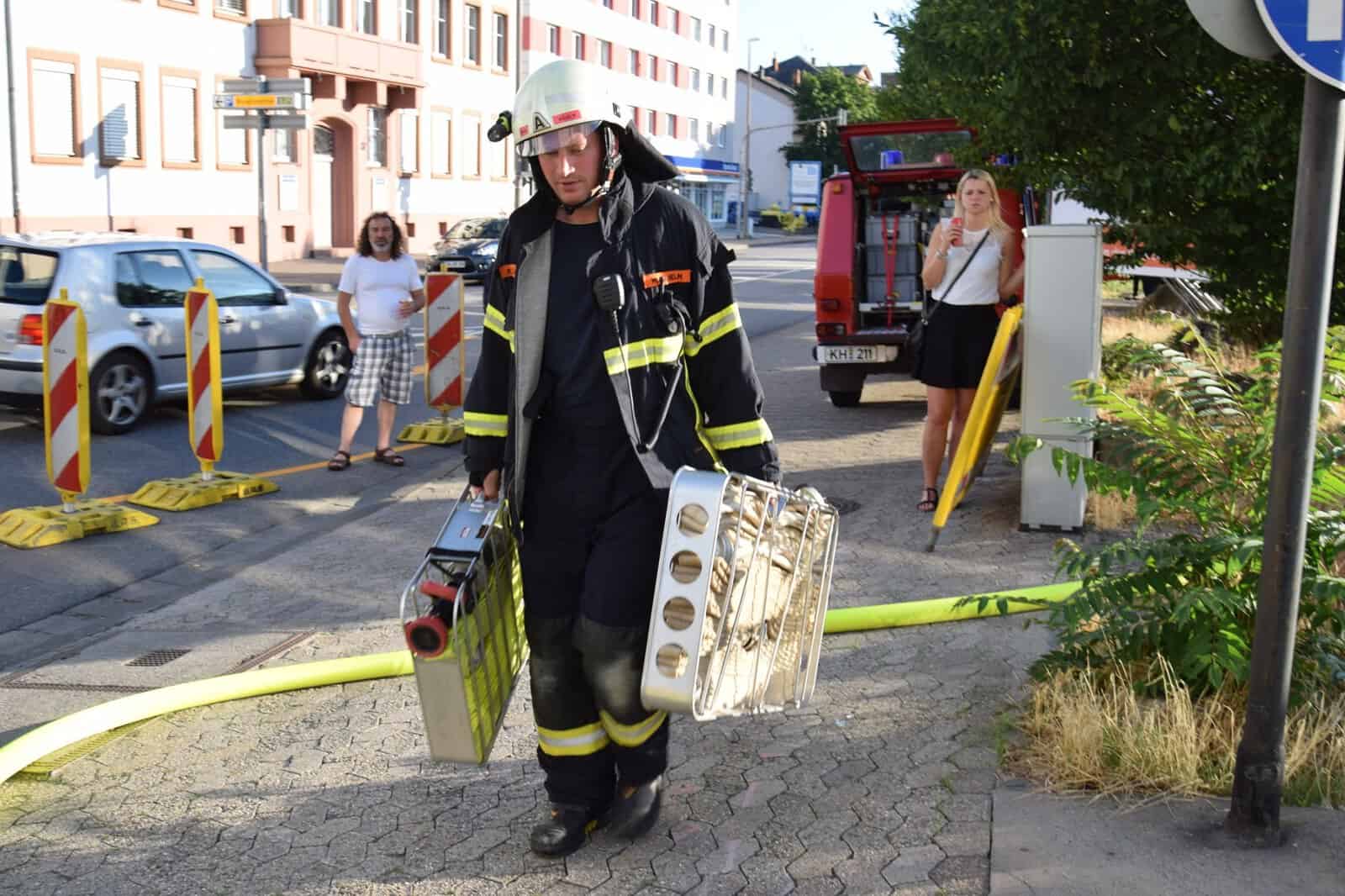 Die ersten angerückten Kräfte öffneten mit einem hydraulischen Türöffnungswerkzeug die Haupteingangstür, um in das Gebäude zu gelangen. Zwei Trupps unter Atemschutz gingen mit 2 C-Rohren zur Personenrettung und Brandbekämpfung über das Treppenhaus vor. Parallel wurde die Drehleiter in Stellung gebracht, um die beiden auf dem Dach befindlichen Personen zu retten. Die Person mit der Rückenverletzung musste schonend auf einer Trage auf der Tragehalterung am Korb der Drehleiter zu Boden gebracht werden. Dafür hatte sich Volksbankmitarbeiter Odo Steinmann (Vorstand Leitung Produktion/Steuerung) freiwillig gemeldet. Die Atemschutztrupps hatten nach und nach die vier Personen im Gebäude aufgespürt und ins Freie verbracht. Dabei wurden verschiedene Türöffnungsmethoden mit diversen Aufbruchswerkzeugen angewendet. Für eine Person kam jede Hilfe zu spät. Sie wurde in einer Schleifkorbtrage nach unten getragen. Die verrauchten Räumlichkeiten wurden mit einem Belüftungsgerät entraucht. Nach etwa einer Stunde hieß es dann Übungsende. An der Übung nahmen über 30 Feuerwehrleute mit insgesamt sieben Fahrzeugen des Löschbezirks Süd und der Freiwilligen Feuerwehr Hackenheim teil. Die Übungsleiter waren mit dem Ergebnis und der Zusammenarbeit der Wehrleute sehr zufrieden, besonders weil eine Außentemperatur von weit über 30°C vorherrschte und die Wehrleute besonders bei der Personenrettung unter Atemschutz in der Hitzeschutzbekleidung dadurch an ihr Limit gehen mussten. Odo Steinmann und Andreas Weber (Bauleiter der Firma Schoofs aus Frankfurt am Main) bedankte sich für den gezeigten Einsatz der Wehrleute und luden im Anschluss zu Kaltgetränken und Verpflegung ein. Auch die Übungsleiter und die Wehrleiterin Manuela Liebetanz bedankten sich beim Vorstand der Volksbank Rhein-Nahe-Hunsrück für die Möglichkeit in dem Objekt unter sehr realen Bedingungen üben zu können. Wo können sonst Türen zu Übungszwecken aufgebrochen werden? Und auch das will bei einem Realeinsatz geübt sein.