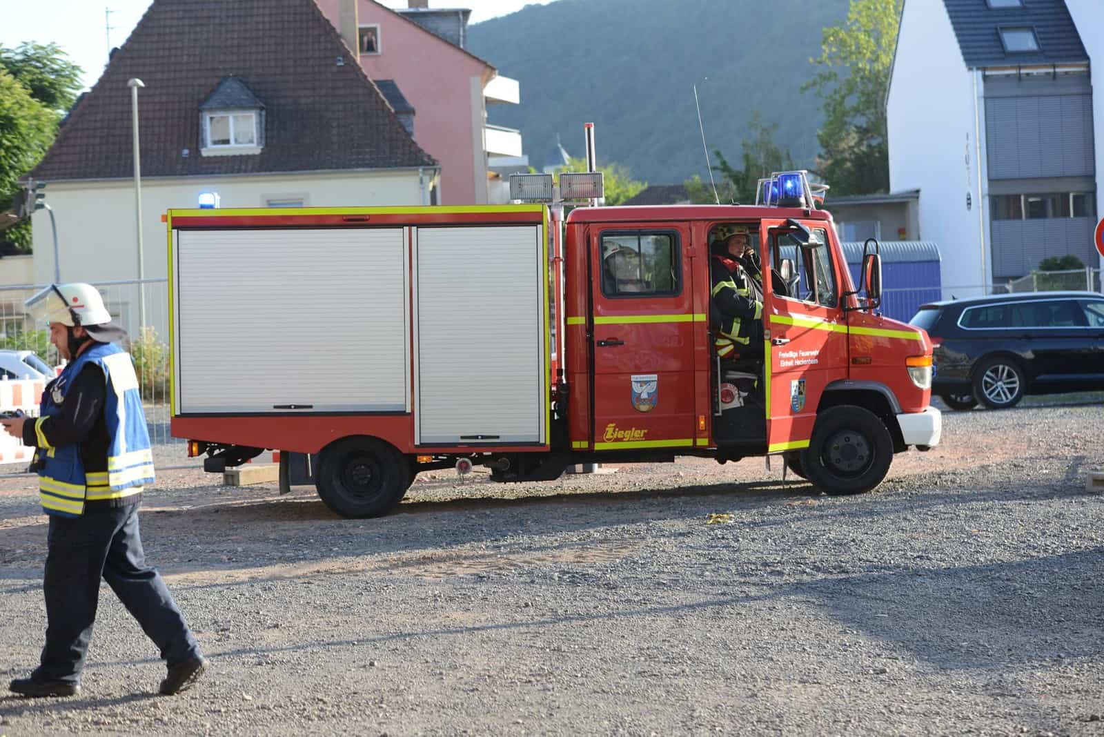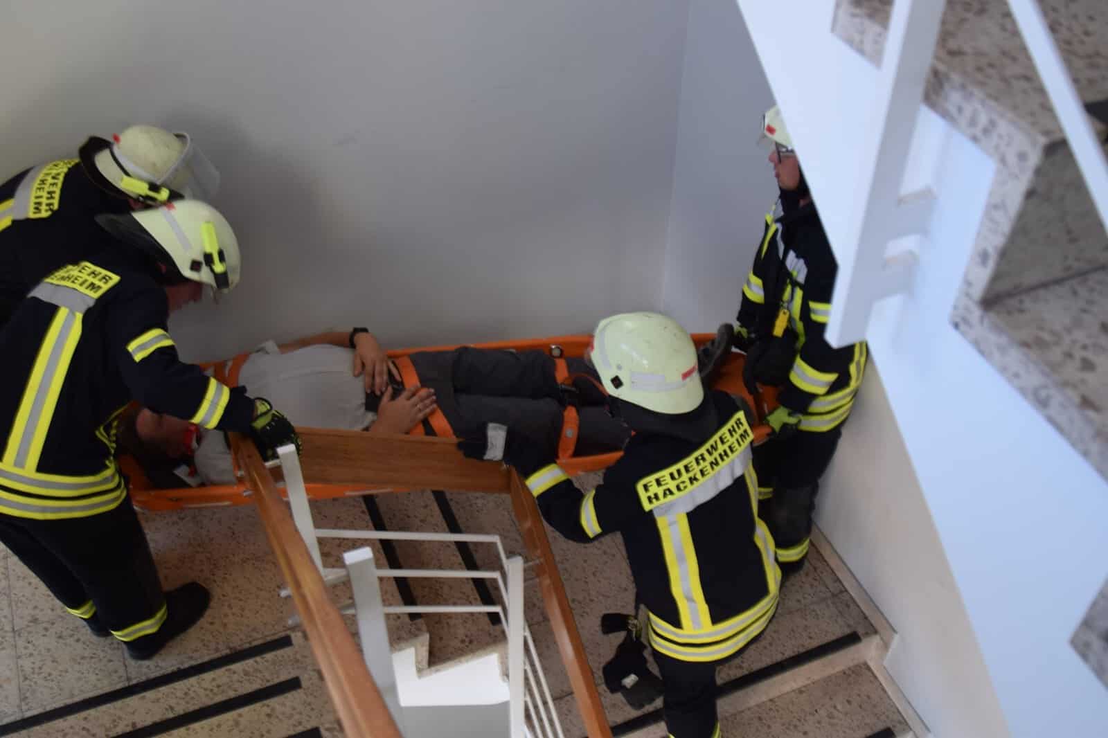 Gestern Abend gegen 19:20 Uhr wurden wir zu einem Übungsalarm im Abrissgebäude der Volksbank Rhein-Nahe-Hunsrück in der Salinenstr. alarmiert. Die Übungsleiter Alexander Zeller, Jeffrey Mitchel (beide Löschbezirk Süd) und Thorsten Gerhardt (Freiwillige Feuerwehr Hackenheim) hatten sich folgendes Übungsszenario ausgedacht. Fremde Personen feierten in dem zum Abriss leerstehenden Gebäude der Volksbank eine Party, die aus dem Ruder läuft. Es bricht ein Brandim 2. Obergeschoss aus. Insgesamt befinden sich sechs Personen im Gebäude (alles Mitarbeiter der Volksbank), wovon sich zwei auf die Dachterrasse retten können. Eine Person erlitt einen Beinbruch und die zweite Person hatte eine Rückenverletzung. Die anderen vier Personen befanden sich irgendwo im Gebäude. Mit einer Nebelmaschine und Rauchgranaten wurde eine starke Verrauchung aus dem Treppenraum heraus simuliert.