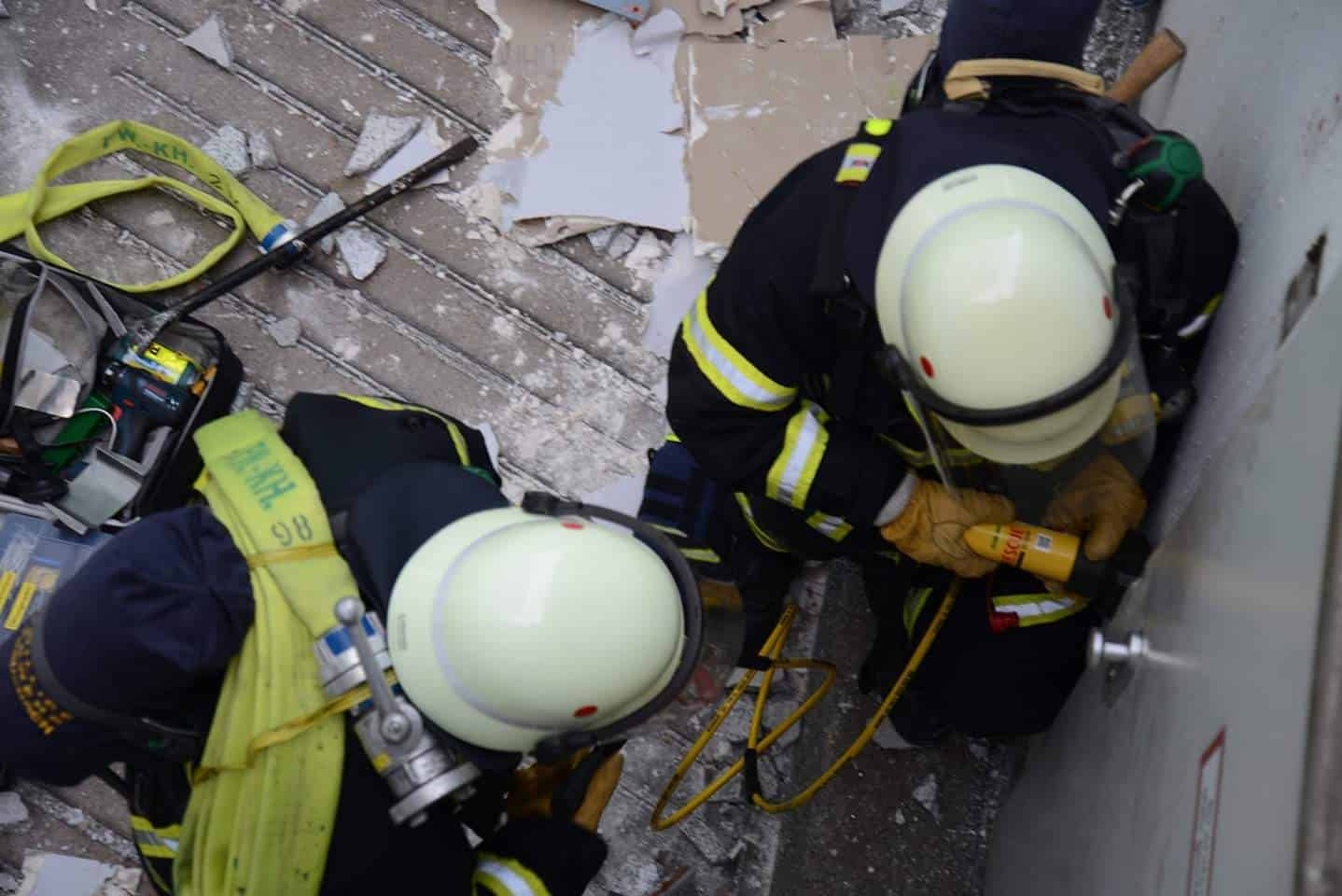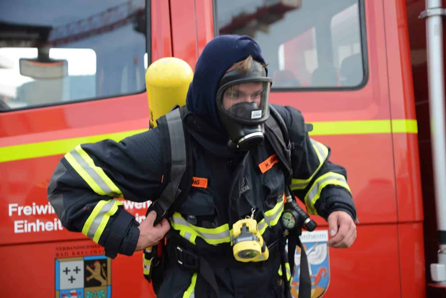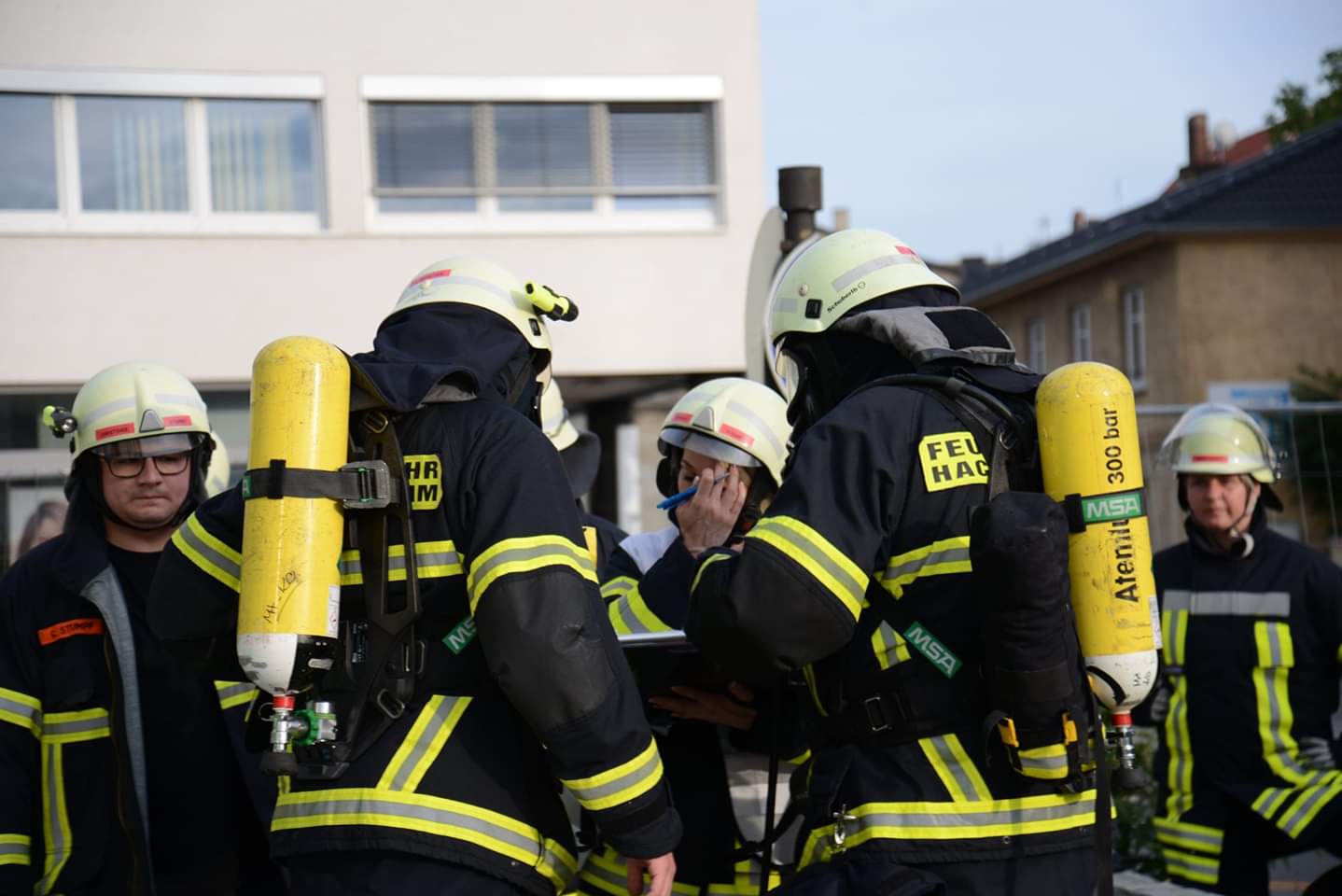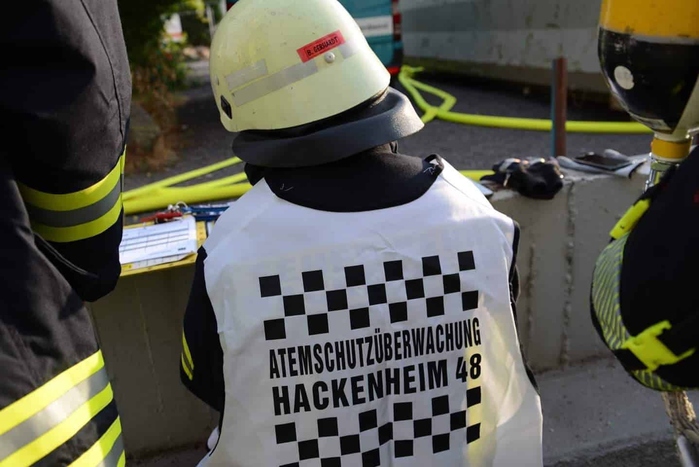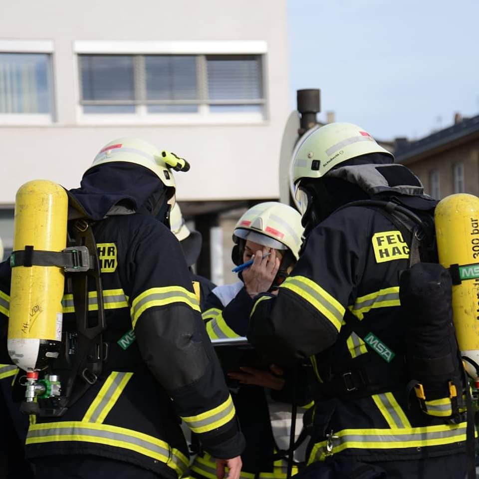 Die ersten angerückten Kräfte des Löschbezirkes Süd der FFW KH öffneten mit einem hydraulischen Türöffnungswerkzeug die Eingangstür, um in die verschlossene Tiefgarage zu gelangen. Zwei Trupps des LB Süd gingen unter Atemschutz mit 2 C-Rohren zur Personenrettung und Brandbekämpfung in die Tiefgarage vor. Ihnen wurde die Sichtscheibe der Atemschutzmaske abgedeckt, damit sie sich tastend in dem unbekannten Raum fortbewegen mussten. Damit wurde eine komplette Verrauchung der Tiefgarage bei null Sicht simuliert. Parallel wurde ein Belüftungsgerät zur Entrauchung vor der Tiefgarage aufgebaut. Wir stellten zwei Sicherheitstrupps unter Atemschutz und bauten die Wasserversorgung von einem Hydranten auf. Die vermisste Person in der Tiefgarage wurde zügig gefunden und ins Freie verbracht. Ein weiteres Übungsszenario sah vor, dass plötzlich eine Kameradin unter Atemschutz bewusstlos wurde. Sofort wurde von dem zweiten Kameraden des Angriffstrupps ein Mayday abgesetzt und die beiden für solche Notfälle bereitstehende Atemschutztrupps unserer Wehr, gingen umgehend mit einer Schleifkorbtrage vor. In kurzer Zeit war die Kameradin in der Trage liegend aus dem Gefahrenbereich gerettet worden. Nach etwa 90 Minuten hieß es dann Übungsende. An der Übung nahmen über 30 Feuerwehrleute mit insgesamt sieben Fahrzeugen des Löschbezirks Süd und der Freiwilligen Feuerwehr Hackenheim teil. Die Übungsleiter waren mit dem Ergebnis und der Zusammenarbeit der Wehrleute sehr zufrieden. Einige Optimierungsmöglichkeiten wurden gemeinsam besprochen. Im Nachgang der Übung wurde noch das Fognail Nebellöschsystem in dem Gebäude ausprobiert. Hierbei wurde ein Loch in die Zimmertür geschlagen und eine Art Löschlanze durch die verschlossene Tür getrieben. Aus den Düsen trat dann im Innern des Raumes ein Wassernebel mit verschiedenen Sprühbildern aus und löschte den imaginären Brand, ohne dass in den Raum selbst vorgegangen werden musste. Diese Art der Brandbekämpfung wurde in der Vergangenheit schon bei einem Dehnfugenbrand zwischen 2 Häusern eingesetzt, bei dem ein Ablöschen mit einem herkömmlichen Strahlrohr wirkungslos war. Da die Abrissarbeiten des alten Volksbankgebäudes mittlerweile schon sehr weit fortgeschritten sind, war dies wohl die letzte Übung der Feuerwehr.