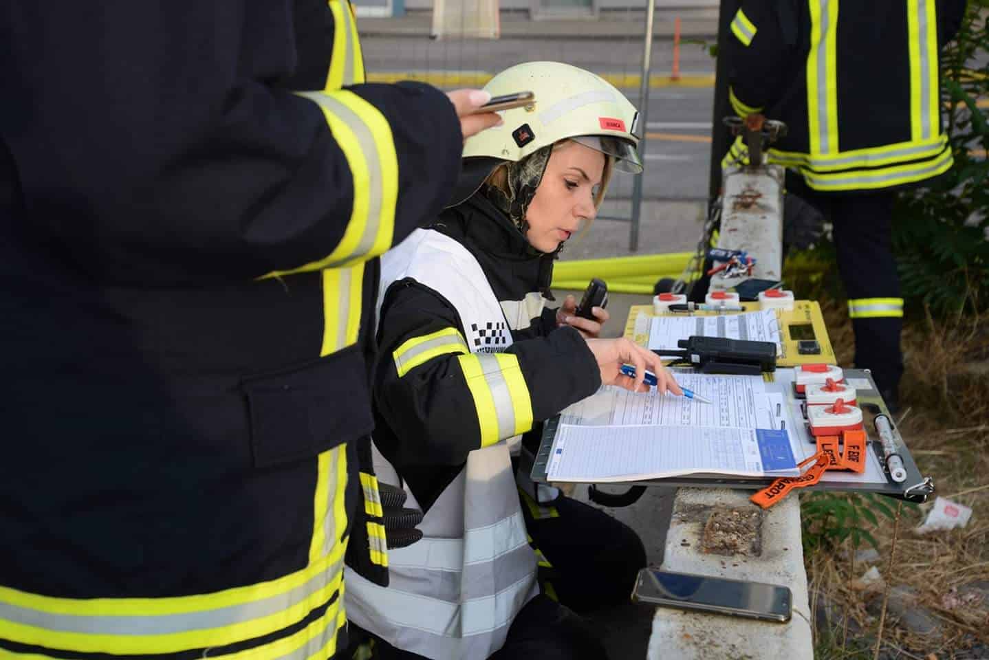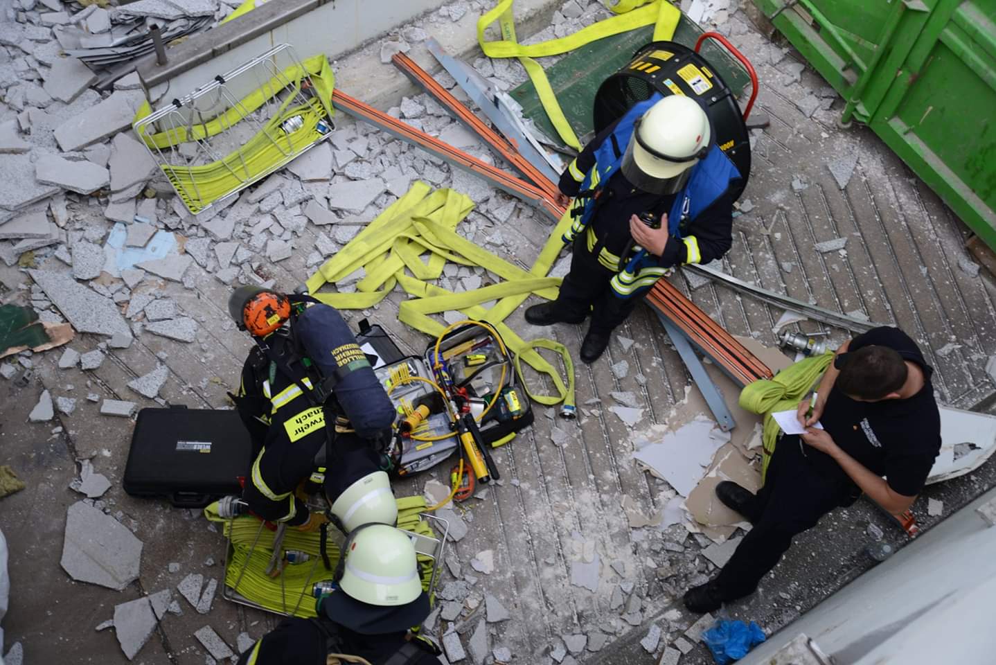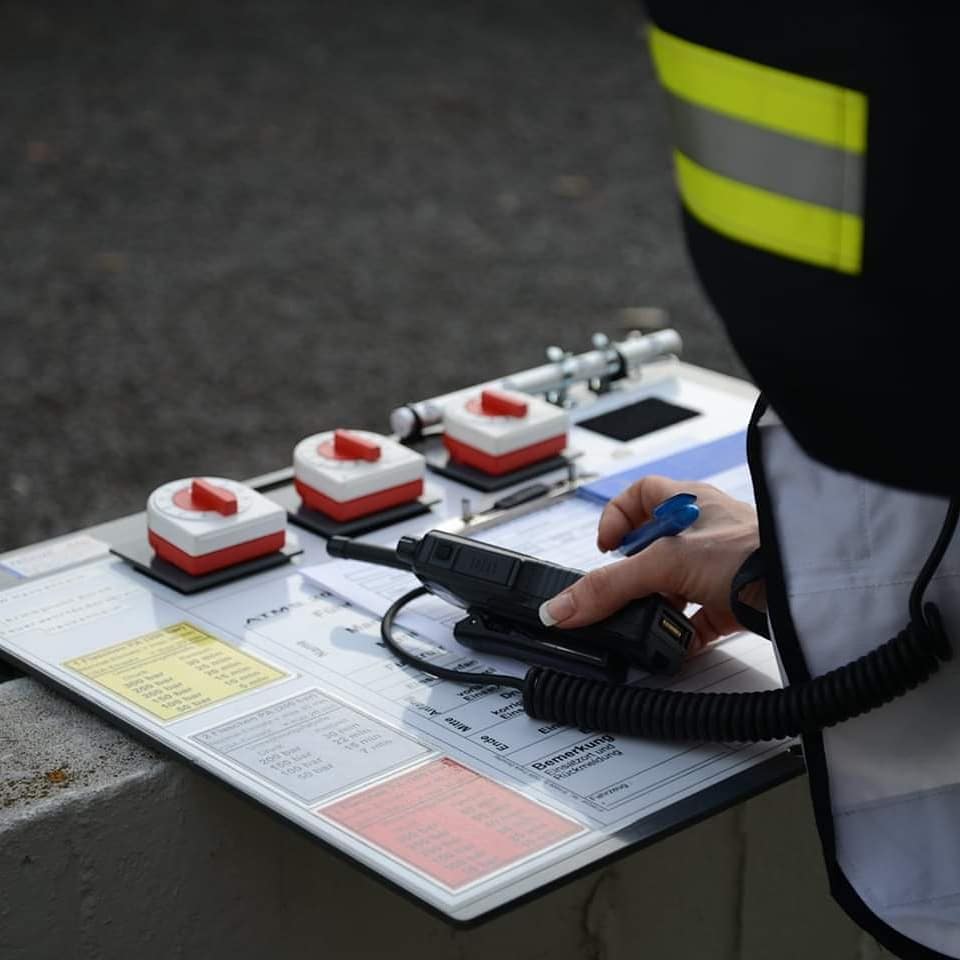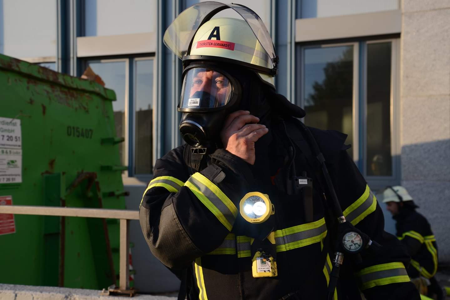 Die ersten angerückten Kräfte des Löschbezirkes Süd der FFW KH öffneten mit einem hydraulischen Türöffnungswerkzeug die Eingangstür, um in die verschlossene Tiefgarage zu gelangen. Zwei Trupps des LB Süd gingen unter Atemschutz mit 2 C-Rohren zur Personenrettung und Brandbekämpfung in die Tiefgarage vor. Ihnen wurde die Sichtscheibe der Atemschutzmaske abgedeckt, damit sie sich tastend in dem unbekannten Raum fortbewegen mussten. Damit wurde eine komplette Verrauchung der Tiefgarage bei null Sicht simuliert. Parallel wurde ein Belüftungsgerät zur Entrauchung vor der Tiefgarage aufgebaut. Wir stellten zwei Sicherheitstrupps unter Atemschutz und bauten die Wasserversorgung von einem Hydranten auf. Die vermisste Person in der Tiefgarage wurde zügig gefunden und ins Freie verbracht. Ein weiteres Übungsszenario sah vor, dass plötzlich eine Kameradin unter Atemschutz bewusstlos wurde. Sofort wurde von dem zweiten Kameraden des Angriffstrupps ein Mayday abgesetzt und die beiden für solche Notfälle bereitstehende Atemschutztrupps unserer Wehr, gingen umgehend mit einer Schleifkorbtrage vor. In kurzer Zeit war die Kameradin in der Trage liegend aus dem Gefahrenbereich gerettet worden. Nach etwa 90 Minuten hieß es dann Übungsende. An der Übung nahmen über 30 Feuerwehrleute mit insgesamt sieben Fahrzeugen des Löschbezirks Süd und der Freiwilligen Feuerwehr Hackenheim teil. Die Übungsleiter waren mit dem Ergebnis und der Zusammenarbeit der Wehrleute sehr zufrieden. Einige Optimierungsmöglichkeiten wurden gemeinsam besprochen. Im Nachgang der Übung wurde noch das Fognail Nebellöschsystem in dem Gebäude ausprobiert. Hierbei wurde ein Loch in die Zimmertür geschlagen und eine Art Löschlanze durch die verschlossene Tür getrieben. Aus den Düsen trat dann im Innern des Raumes ein Wassernebel mit verschiedenen Sprühbildern aus und löschte den imaginären Brand, ohne dass in den Raum selbst vorgegangen werden musste. Diese Art der Brandbekämpfung wurde in der Vergangenheit schon bei einem Dehnfugenbrand zwischen 2 Häusern eingesetzt, bei dem ein Ablöschen mit einem herkömmlichen Strahlrohr wirkungslos war. Da die Abrissarbeiten des alten Volksbankgebäudes mittlerweile schon sehr weit fortgeschritten sind, war dies wohl die letzte Übung der Feuerwehr.