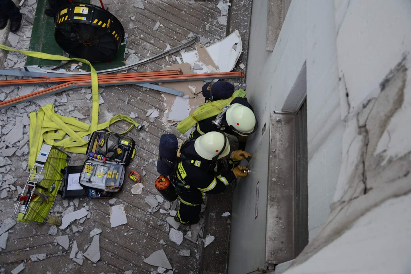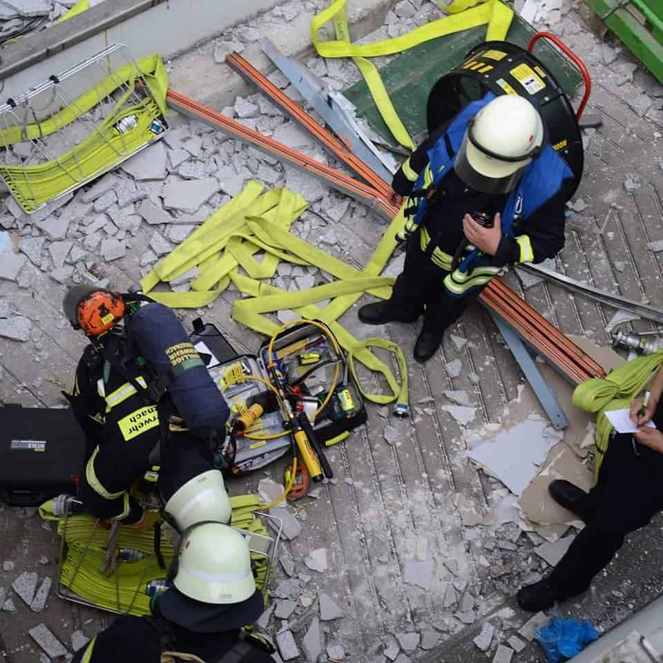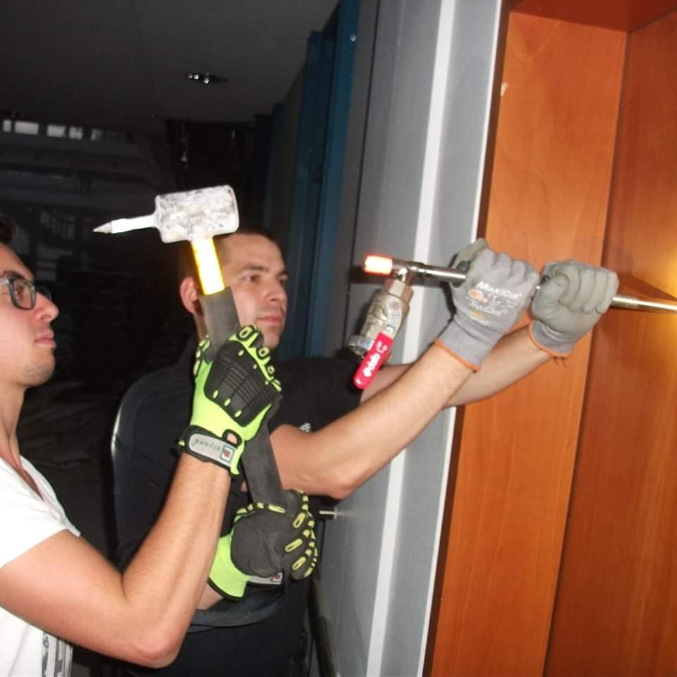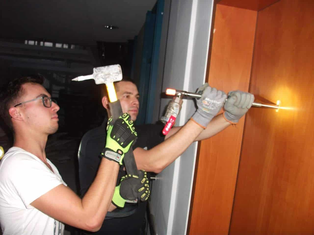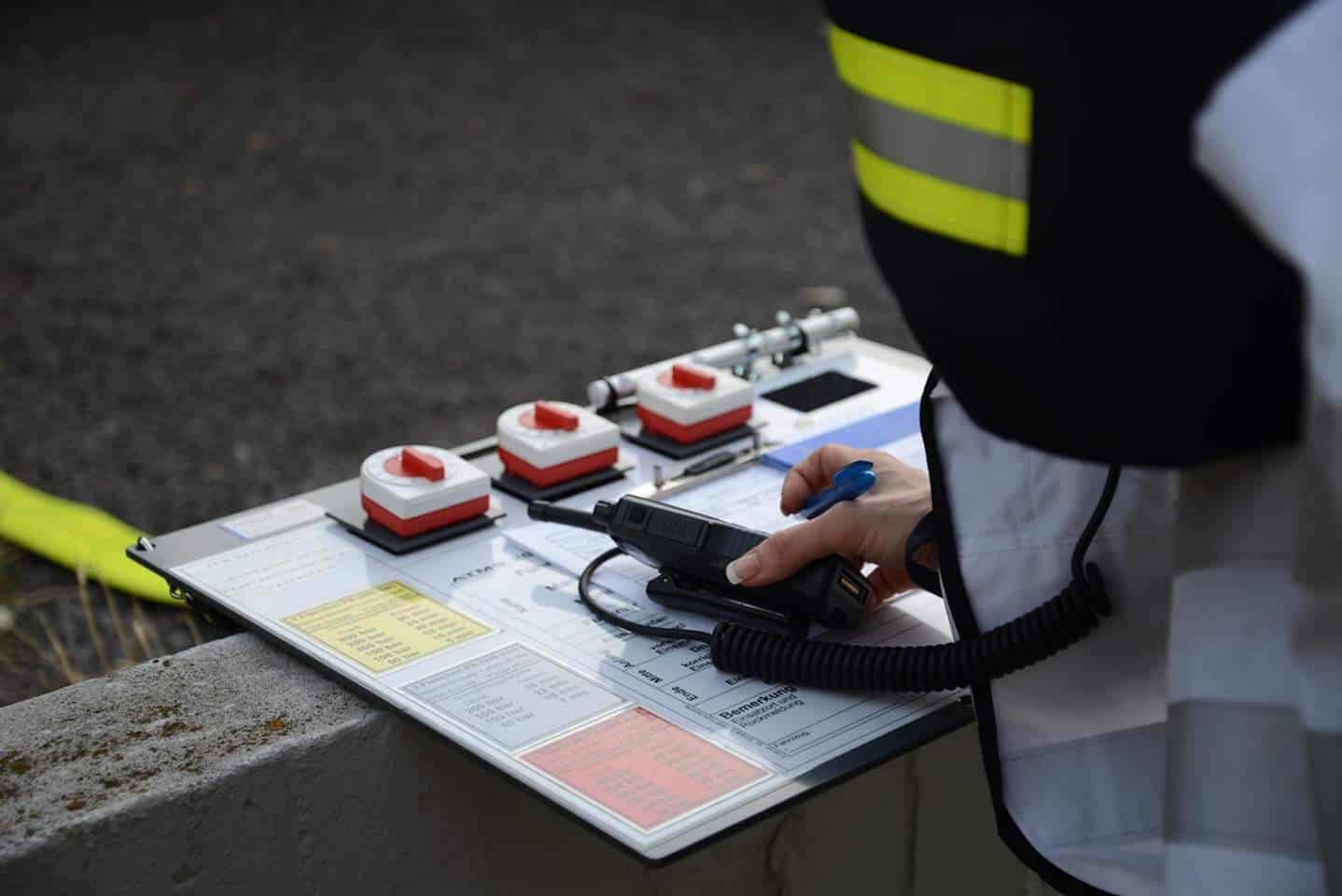 Die ersten angerückten Kräfte des Löschbezirkes Süd der FFW KH öffneten mit einem hydraulischen Türöffnungswerkzeug die Eingangstür, um in die verschlossene Tiefgarage zu gelangen. Zwei Trupps des LB Süd gingen unter Atemschutz mit 2 C-Rohren zur Personenrettung und Brandbekämpfung in die Tiefgarage vor. Ihnen wurde die Sichtscheibe der Atemschutzmaske abgedeckt, damit sie sich tastend in dem unbekannten Raum fortbewegen mussten. Damit wurde eine komplette Verrauchung der Tiefgarage bei null Sicht simuliert. Parallel wurde ein Belüftungsgerät zur Entrauchung vor der Tiefgarage aufgebaut. Wir stellten zwei Sicherheitstrupps unter Atemschutz und bauten die Wasserversorgung von einem Hydranten auf. Die vermisste Person in der Tiefgarage wurde zügig gefunden und ins Freie verbracht. Ein weiteres Übungsszenario sah vor, dass plötzlich eine Kameradin unter Atemschutz bewusstlos wurde. Sofort wurde von dem zweiten Kameraden des Angriffstrupps ein Mayday abgesetzt und die beiden für solche Notfälle bereitstehende Atemschutztrupps unserer Wehr, gingen umgehend mit einer Schleifkorbtrage vor. In kurzer Zeit war die Kameradin in der Trage liegend aus dem Gefahrenbereich gerettet worden. Nach etwa 90 Minuten hieß es dann Übungsende. An der Übung nahmen über 30 Feuerwehrleute mit insgesamt sieben Fahrzeugen des Löschbezirks Süd und der Freiwilligen Feuerwehr Hackenheim teil. Die Übungsleiter waren mit dem Ergebnis und der Zusammenarbeit der Wehrleute sehr zufrieden. Einige Optimierungsmöglichkeiten wurden gemeinsam besprochen. Im Nachgang der Übung wurde noch das Fognail Nebellöschsystem in dem Gebäude ausprobiert. Hierbei wurde ein Loch in die Zimmertür geschlagen und eine Art Löschlanze durch die verschlossene Tür getrieben. Aus den Düsen trat dann im Innern des Raumes ein Wassernebel mit verschiedenen Sprühbildern aus und löschte den imaginären Brand, ohne dass in den Raum selbst vorgegangen werden musste. Diese Art der Brandbekämpfung wurde in der Vergangenheit schon bei einem Dehnfugenbrand zwischen 2 Häusern eingesetzt, bei dem ein Ablöschen mit einem herkömmlichen Strahlrohr wirkungslos war. Da die Abrissarbeiten des alten Volksbankgebäudes mittlerweile schon sehr weit fortgeschritten sind, war dies wohl die letzte Übung der Feuerwehr.