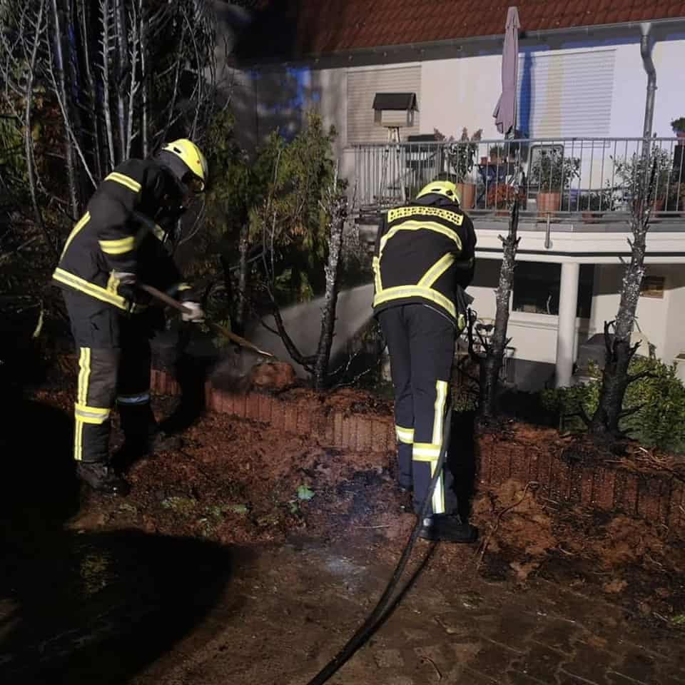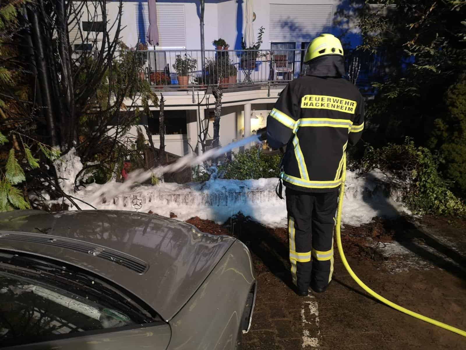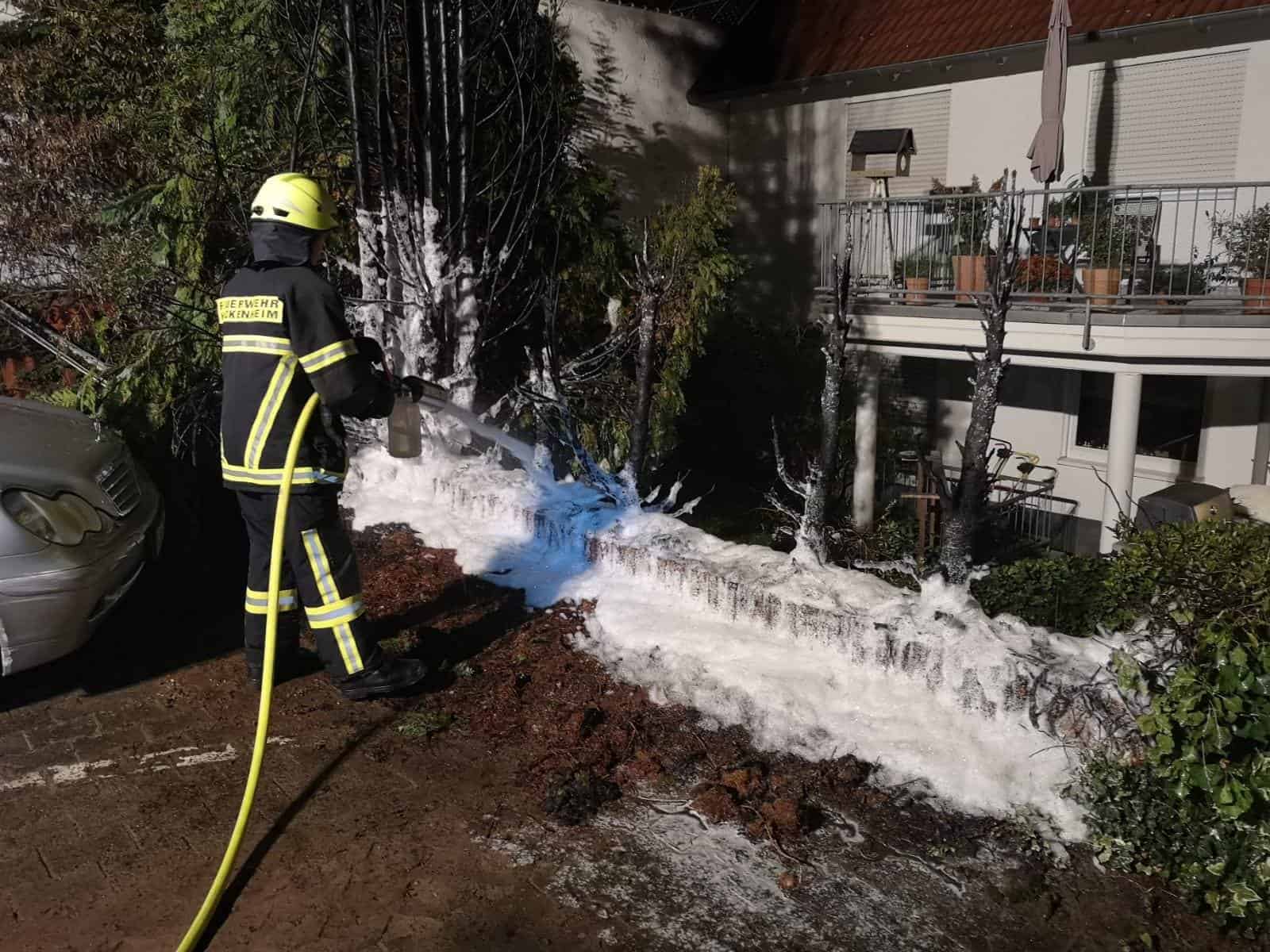 Gegen halb 2 wurden wir zu einem Heckenbrand in die Hauptstraße in Hackenheim alarmiert. Dort brannte an einem Mehrfamilienhaus eine ca. 6m breite Hecke. Beim Eintreffen der Feuerwehr hatten die Anwohner bereits erste Löschmaßnahmen unternommen. Wir löschten den Rest ab und kontrollierten dann mit der Wärmekamera auf weitere Glutnester. Da immer wieder Rauch und Hitze aus den Bodenwurzeln kam, entschloss man sich für einen kleinen Schaumeinsatz. Nach einer Stunde konnten die 17 Einsatzkräfte wieder einrücken. Ebenfalls war die Feuerwehr Volxheim und die Polizei mit vor Ort. Bei dem Brand entstand Sachschaden an einem in der Nähe geparkten Fahrzeug.